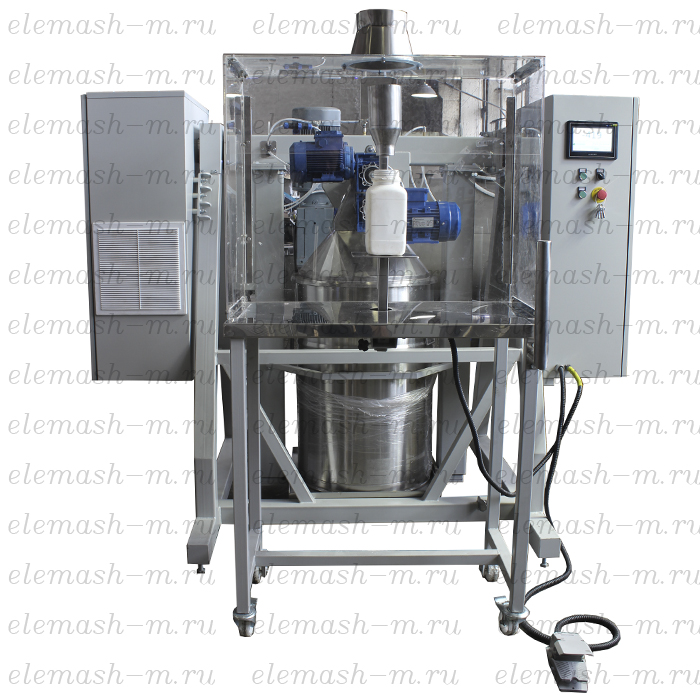После этого оператор позиционирует подкатной столик на штатное место, заводя выходную трубу дозатора вовнутрь кабинета через отверстие в нем. Затем устанавливает на весовую площадку столика тару, соответствующую заданной дозе, и позиционирует тару под насадкой выходной трубы дозатора. Нажимая на ножную педаль, оператор запускает однократный цикл дозирования.